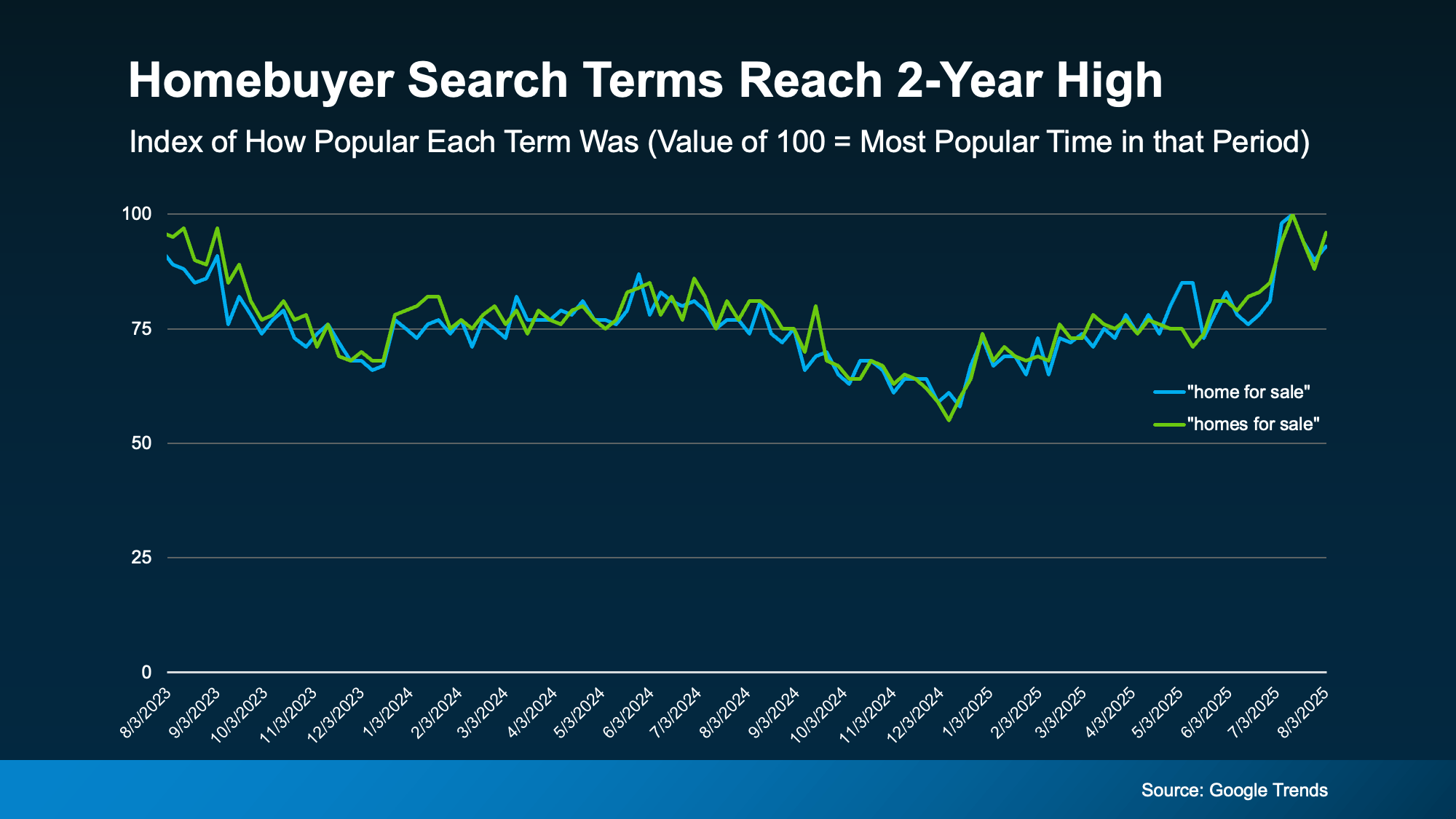 The graph below shows an index of two common homebuyer search phrases and how popular they were on Google over the past two years. The higher the line goes, the more popular that phrase was. A 100 on the graph shows the most popular time for each phrase: